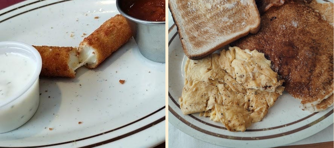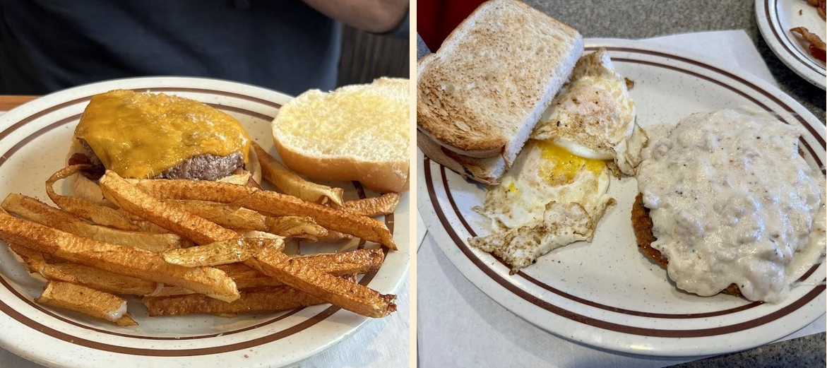 Must-try dishes include the French Toast and Biscuits and Gravy from breakfast. Also, check out the Smothered Chicken and Bacon Cheddar Barbeque Fries for lunch.