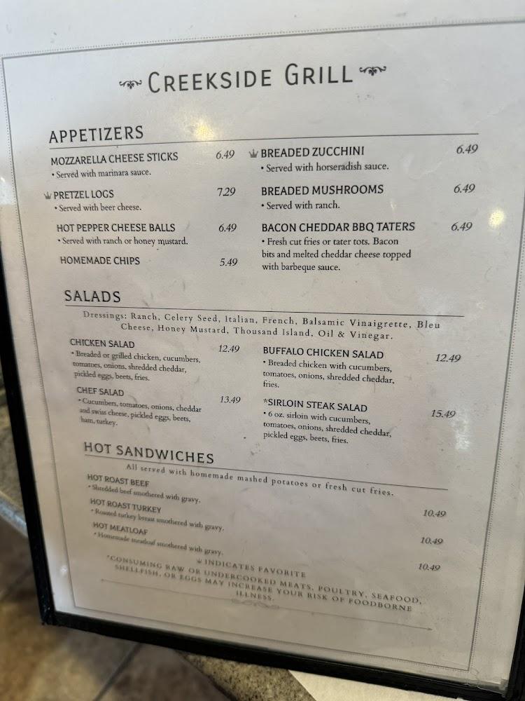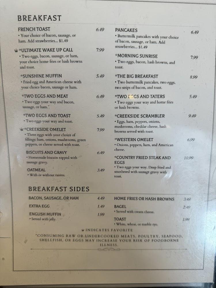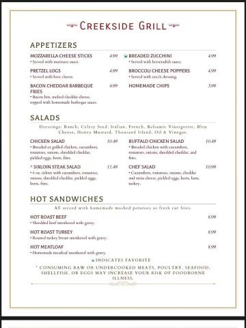 Creekside Grill’s menu provides a blend of comfort food and classic favorites. Breakfast features hearty options like fluffy pancakes and crispy bacon. For lunch and dinner, signature items include country fried steak or hot roast beef sandwiches, warming every heart.